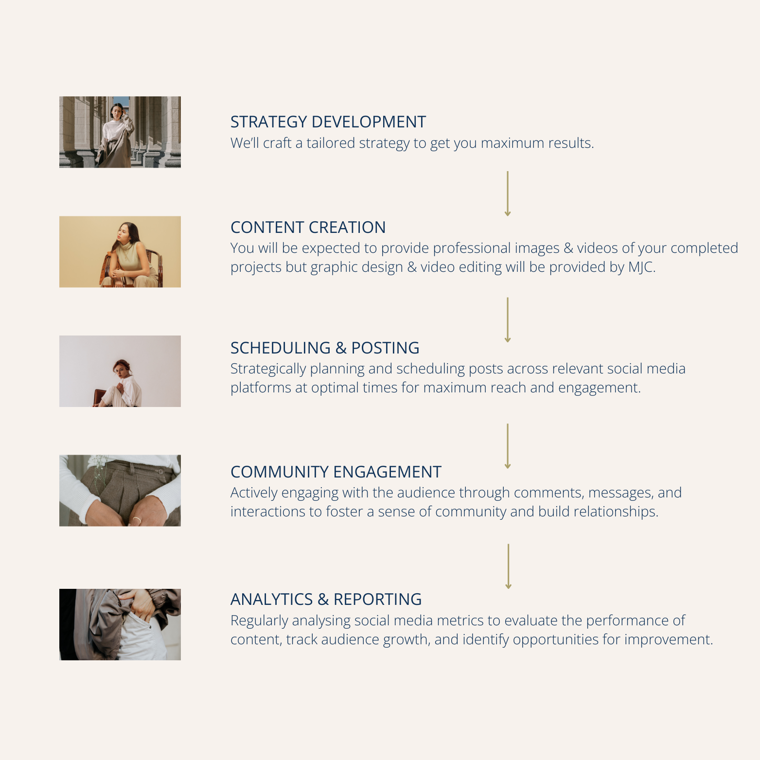 We don’t rush projects so if you’re looking for us to start posting next week we aren’t your people. Onboarding takes 6-8 weeks and only after we have conducted a proper strategy will we start posting content to your page.